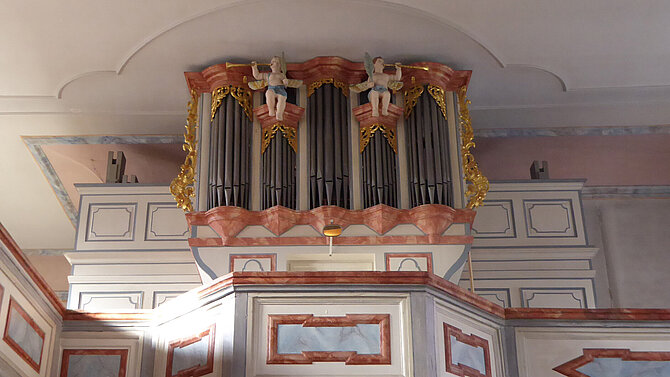 Manual (C,D-c‘‘‘): Gedackt 8‘ Quintadena 8‘ (Bass) Solicional 8‘ (Discant) Principal 4‘ Gedackt 4‘ Quint 3‘ Octave 2‘ Sesquialter 1 1/2‘ Mixtur IV 1‘ Cimbel 1‘ Vox humana 8‘ | Pedal (C,D-f 0 ): Subbaß 16‘ Octavbaß 8‘ Posaune 8‘ Tremulant, Pedalkoppel